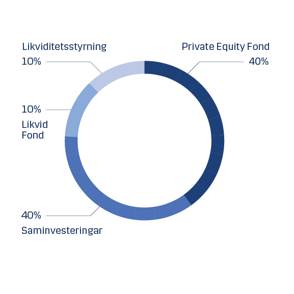 Resterande del investeras i sekundära fonder, dvs. köp av befintliga andelar i private equity-fonder från andra investerare på sekundärmarknaden och i likvida instrument med låg risk, t.ex. statsobligationer.